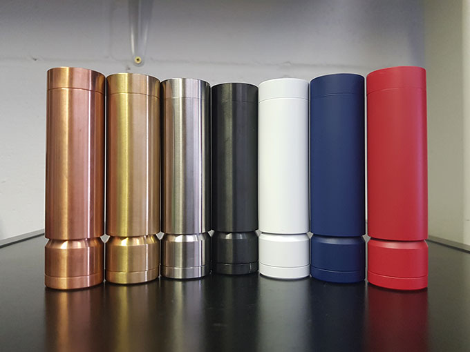 上の画像がカスタム前のノーマルの状態のVAPEの本体(MOD)でこの上にリキッドを入れるパーツや吸口をつけて使用し、カスタムパーツは手で握る真ん中辺りのスリーブと呼ばれるパーツ。