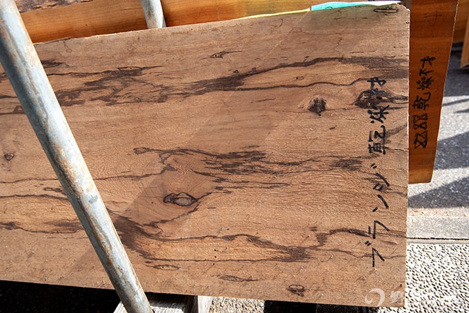 何やら見慣れない木がありました。スポルテッドのような模様の入った板。よーく見るとウェンジやタガヤサンのような模様が見える。