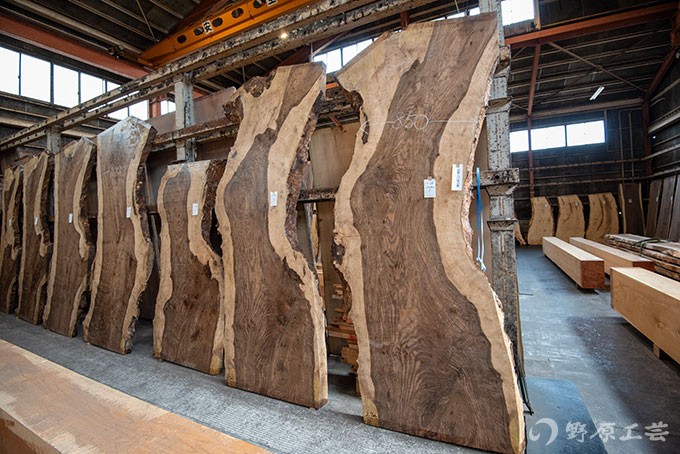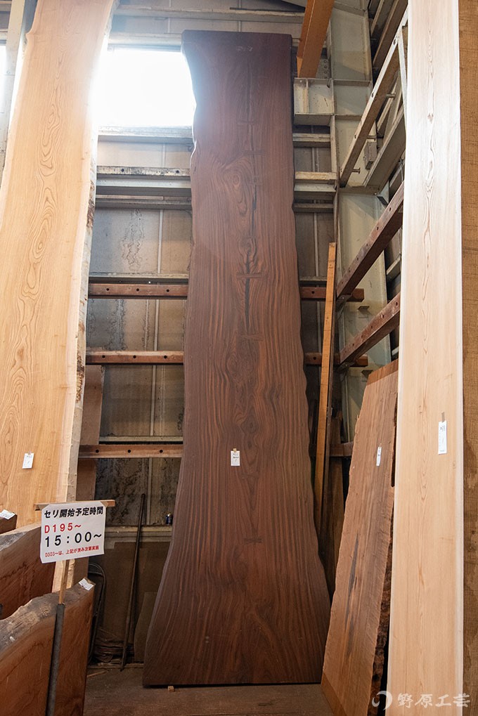 市場では10年以上『栃』の人気(主にテーブル用材)が高く、コンスタントに出品があり、今回も色々な栃の板が並んでいましたが、白くて木目が薄いのが人気と言いつつ、どれも個性があって見ていて楽しいですね。