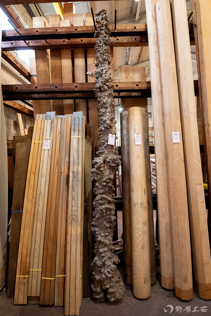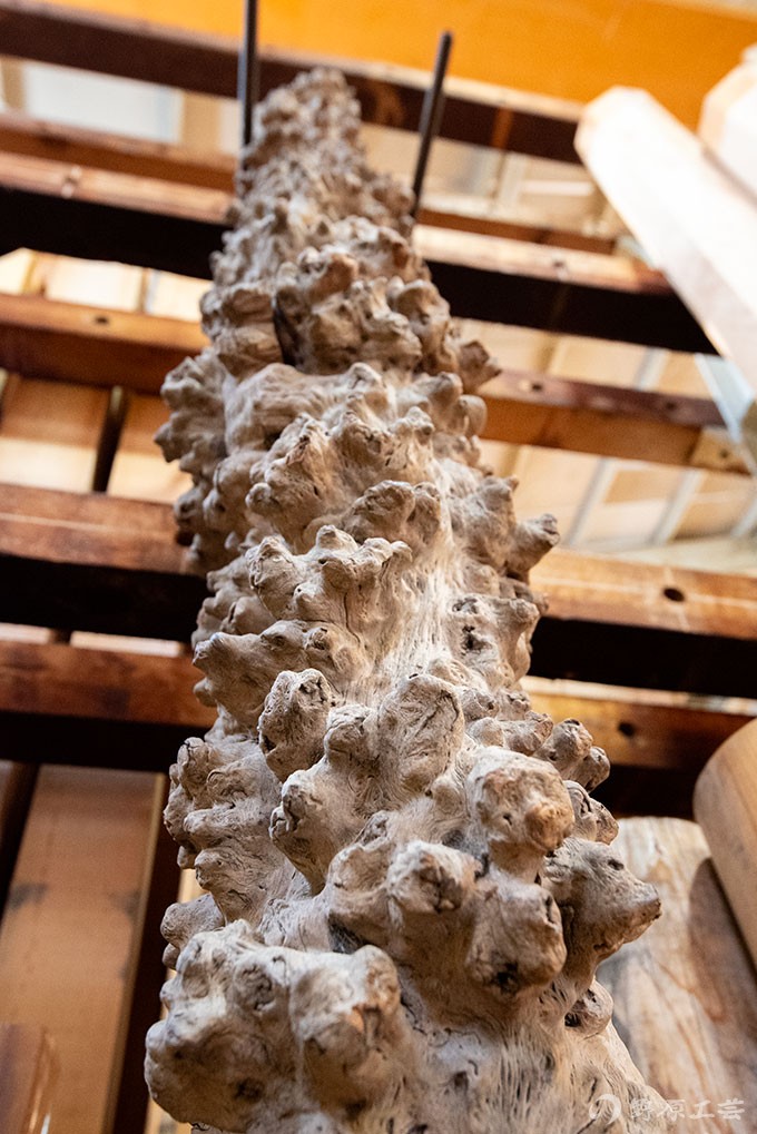 細かい瘤が全体にくっついた不思議な柱材。いるかいらないかは別として、業者さんと面白いけどなんの木だろうねぇと。
