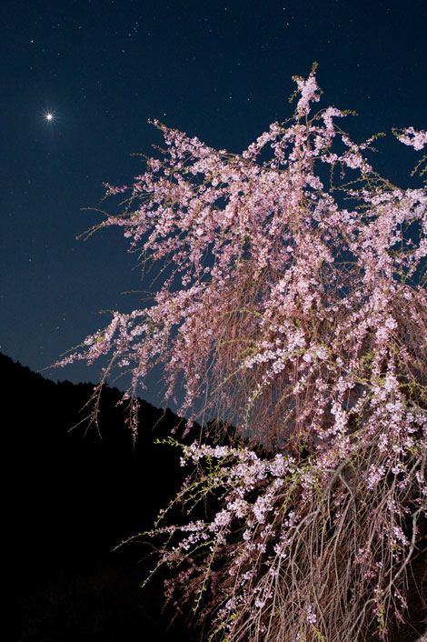 やっとのこと、桜前線が我家のところまでやってきて、現在満開中の当店横の枝垂れ桜…今回は趣向を変えて、夕暮れから夜にかけて撮影してみました♪